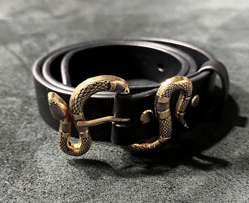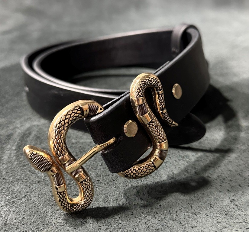 Представляємо чорний шкіряний жіночий пояс із декоративною золотистою пряжкою у формі змії. Ремінь виглядає стильним та модним аксесуаром, що підходить для повсякденного або напівформального образу.