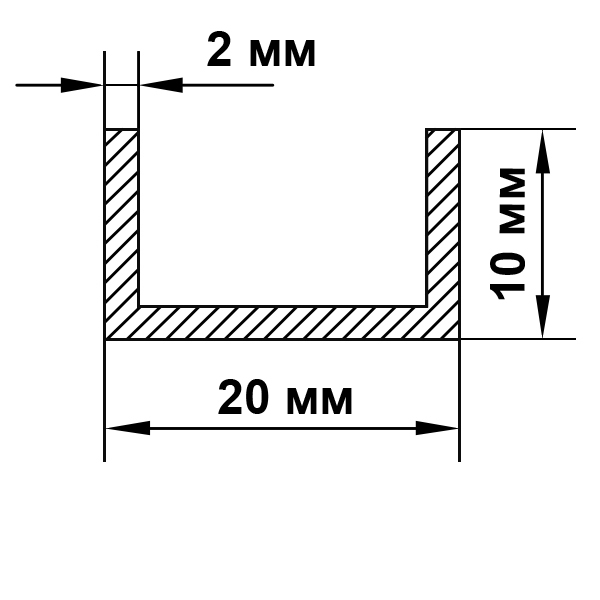 Швелер алюмінієвий | П профіль 20х10х2 (паз 16мм), без покриття